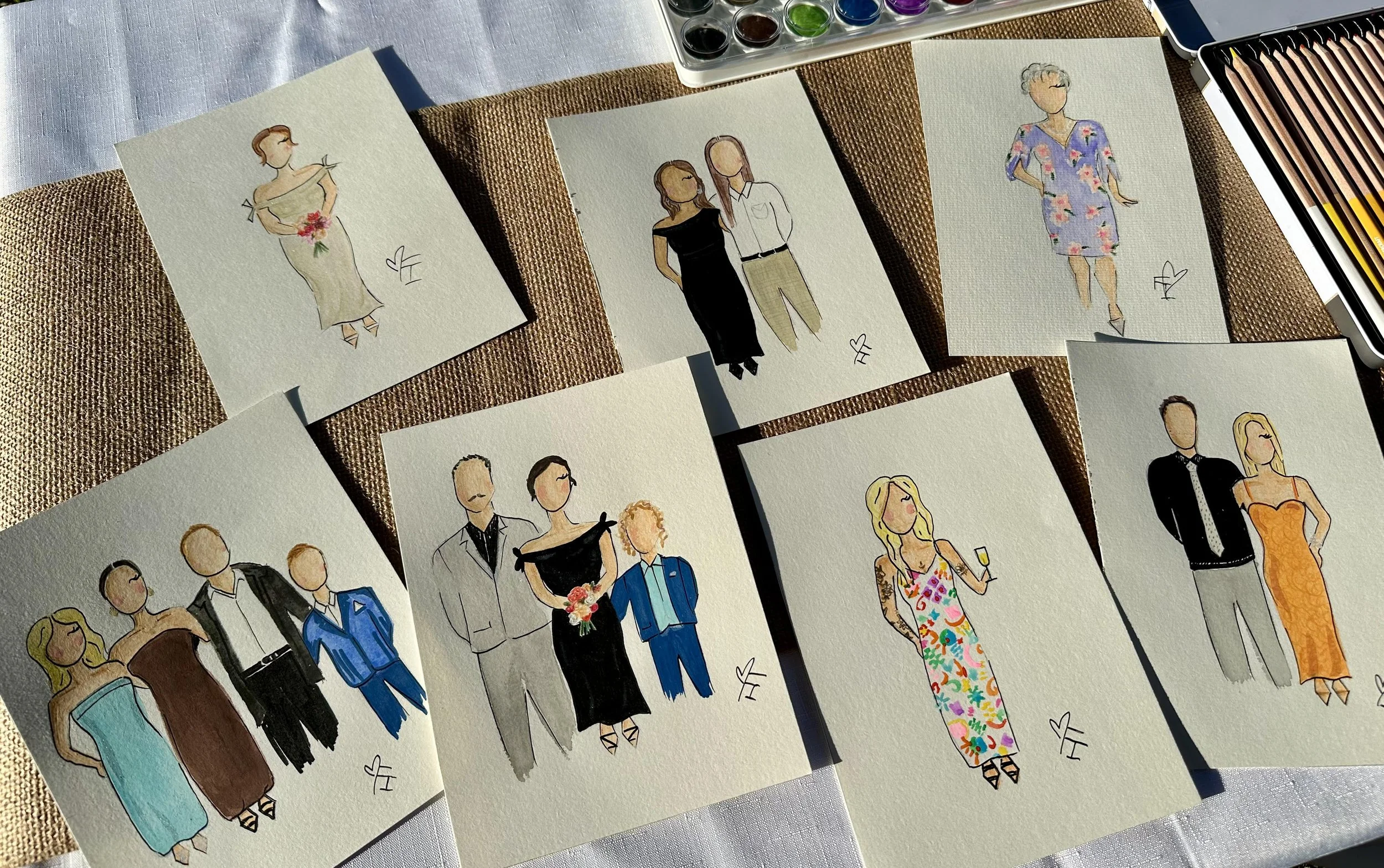 I create live illustrations of your guests at your event to take home at the end of the night. I come to you and set up where you prefer, take photos of your guests (no they don’t have to sit and pose) to then create my illustrations.